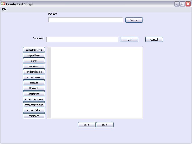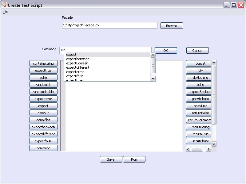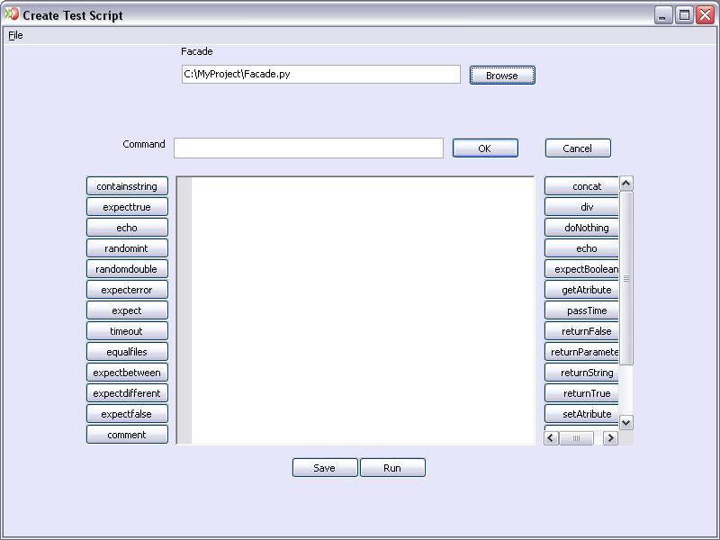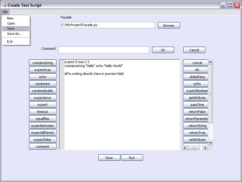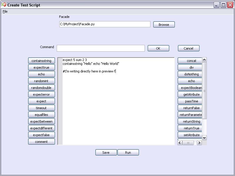 The script test can be created now, typing directly in the 'Command' field, pressing the buttons of the Python EasyAccept commands or the façade commands.