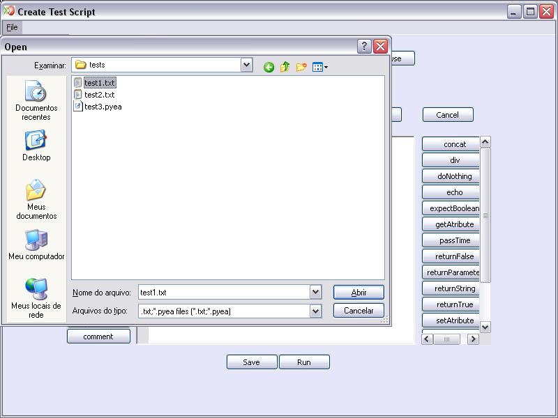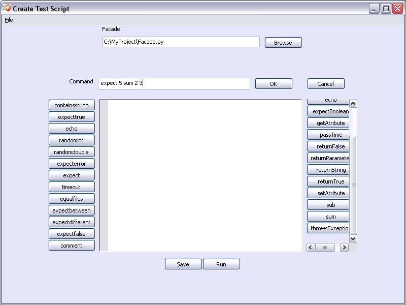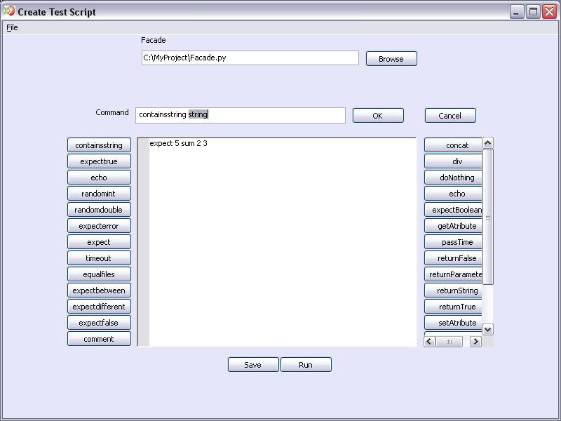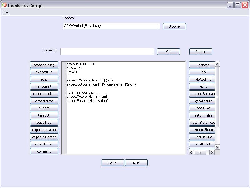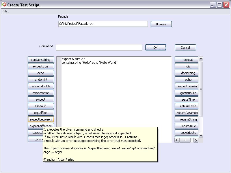 The list of buttons in the left side represents all the commands of the Python EasyAccept, while the list in the right side the commands of the façade. Thus, when a button it's pressed the command will be put in the command field, like this: