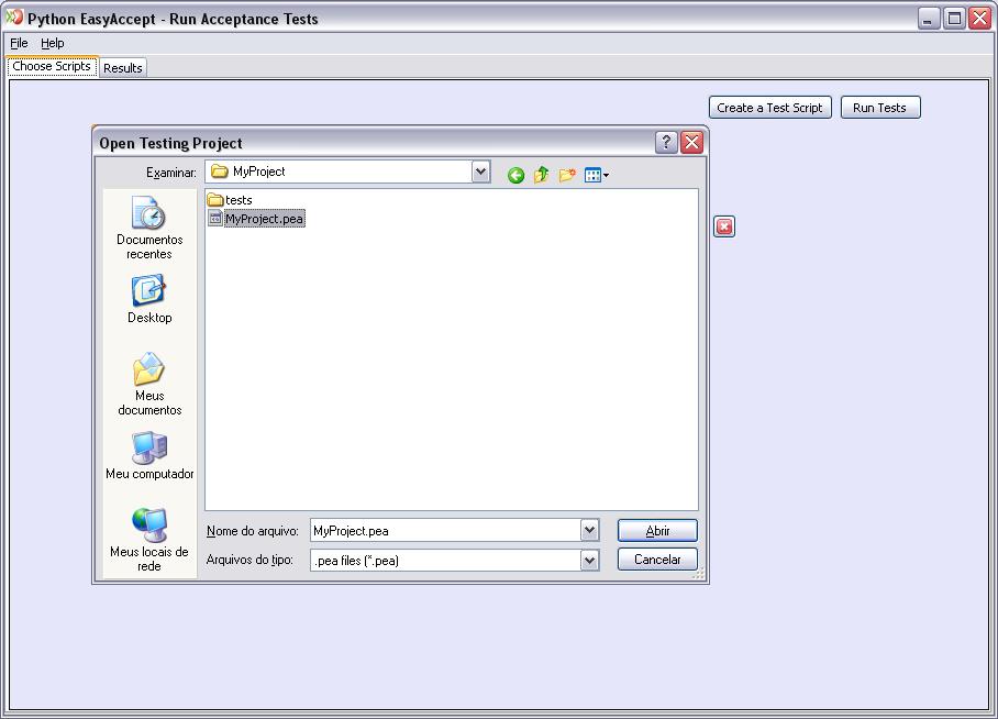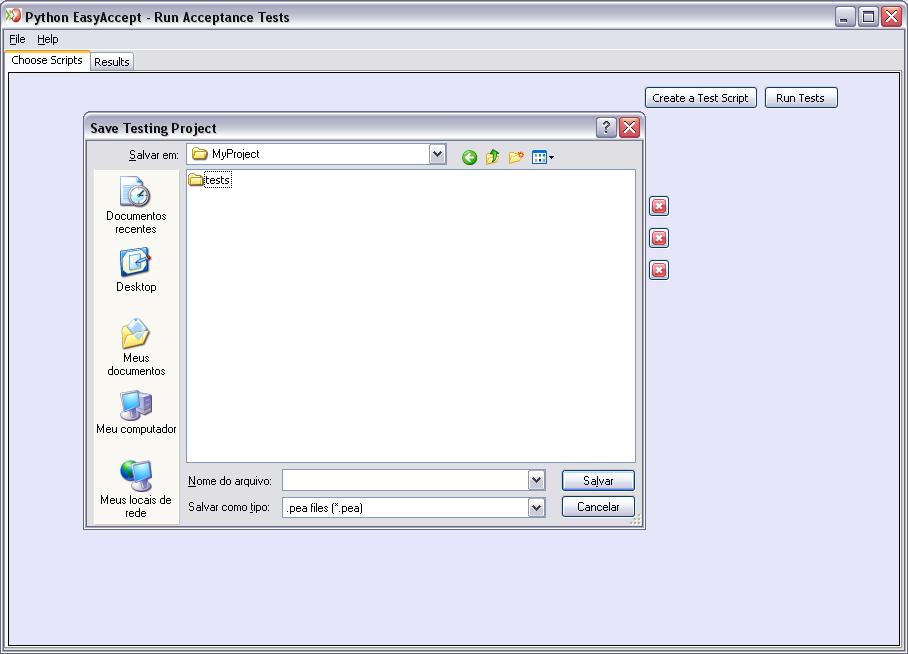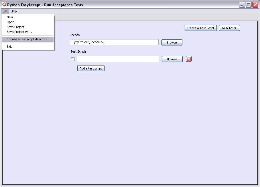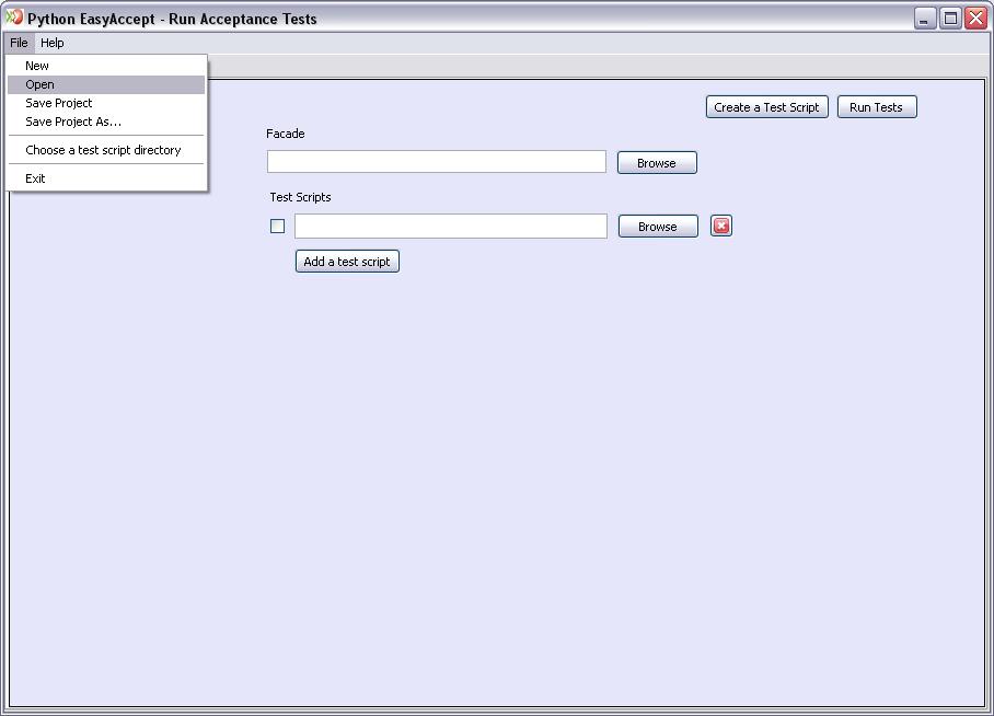 The first screen allows the creation of a Python EasyAccept project. A Python EasyAccept is a project composed of a façade and one or several test scripts. The following figures show the windows of the interface.